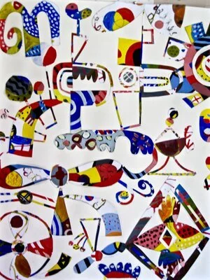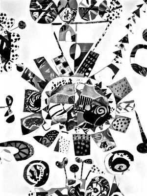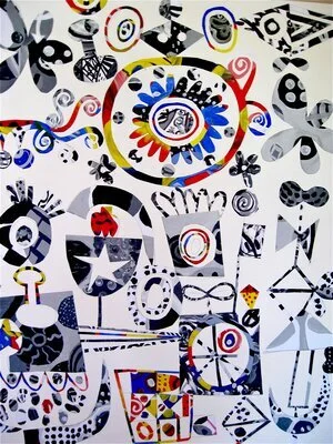 I MAKE COLORFUL, PATTERNED PAINTINGS OFTEN WITH COLLAGED TEXT OR IMAGES WHICH ADD DIMENSION AND CONTEXT.