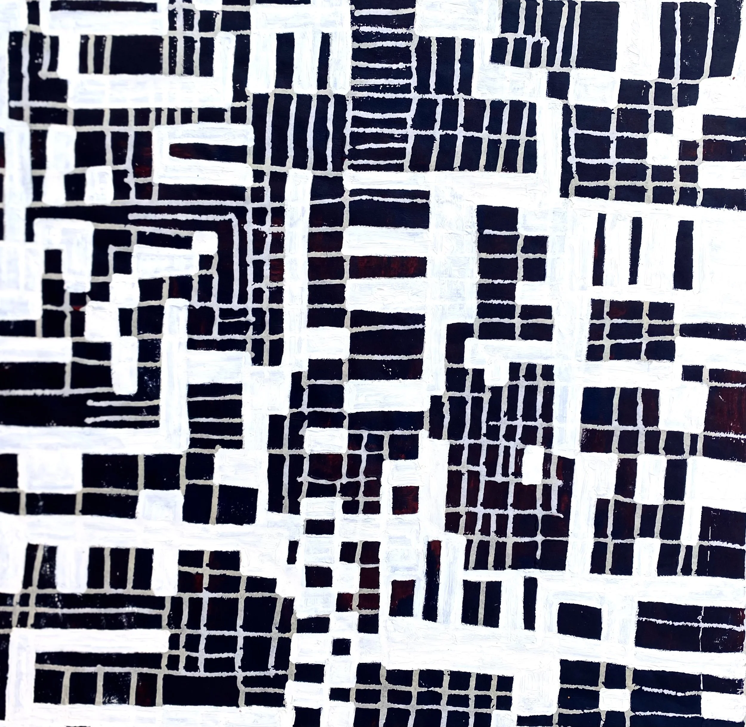 I MAKE COLORFUL, PATTERNED PAINTINGS OFTEN WITH COLLAGED TEXT OR IMAGES WHICH ADD DIMENSION AND CONTEXT.